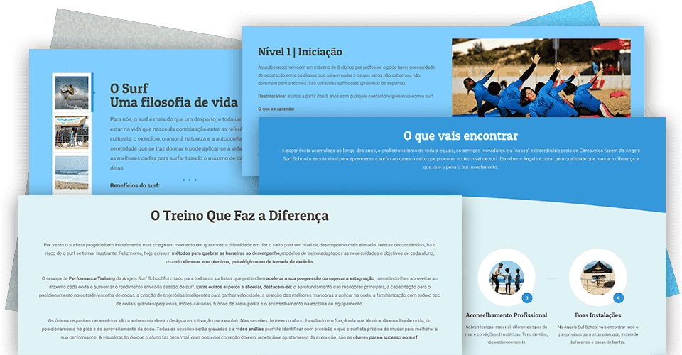 Resultados (setembro 2018): 2º lugar nos resultados orgânicos de pesquisas por palavras-chave prioritárias como “escola de surf carcavelos” e “aulas de surf carcavelos”; 4º lugar para “escola surf lisboa” e “aulas surf lisboa”, entre outras.